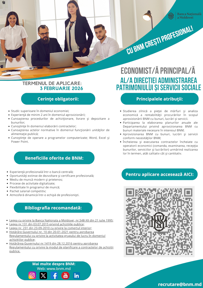 Economist/ă principal/ă al/a Direcției administrarea patrimoniului și servicii sociale