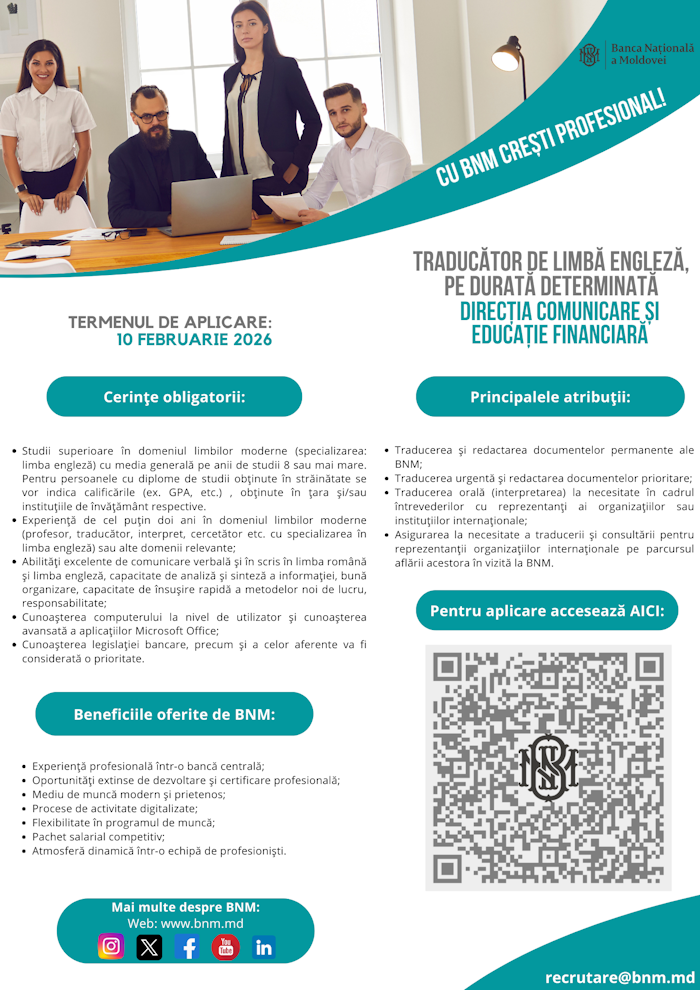 Traducător de limbă engleză, pe durată determinată, în Direcția comunicare și educație financiară